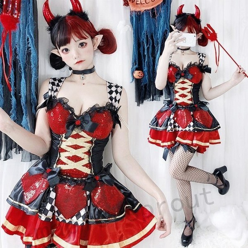 Amazon 道化師ドレス 女の子 デビル ピエロガール ハロウィン 仮装 コスチューム キュート ミニワンピ お化け屋敷変身 イベント 6点セット フリー コスプレ 仮装 通販